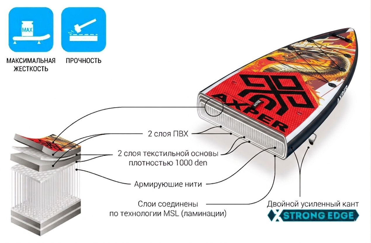 В основе AXPER PRO Dragon Touring 12.6 лежит запатентованная двухслойная технология Double Layer Fusion (DLF), которая устанавливает новый стандарт прочности и жесткости среди надувных досок.