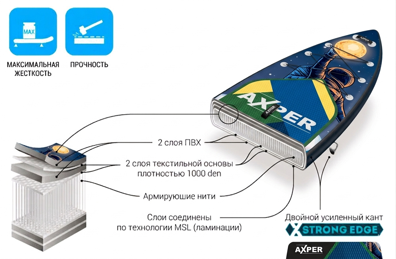 В этой модели компания AXPER использует новейшие технологии производства и лучшие материалы и фурнитуру на рынке SUP досок.